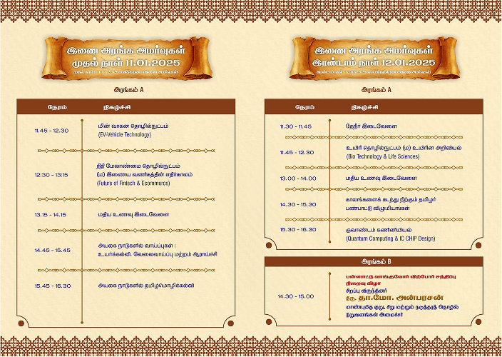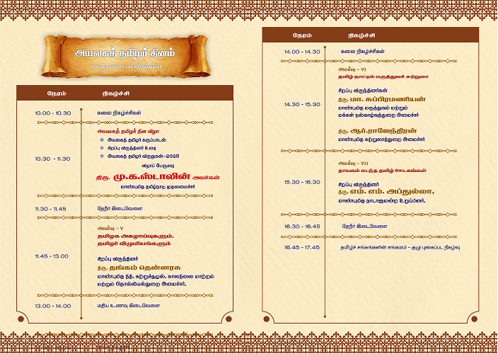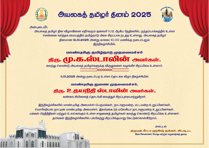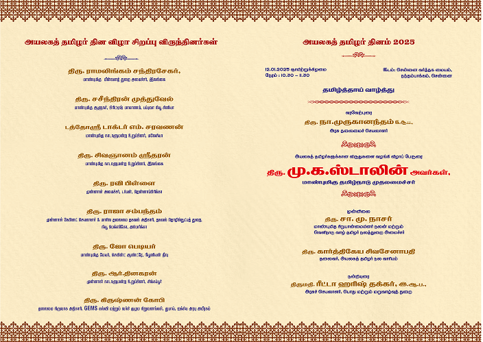 World Tamil Diaspora Day 2024 was celebrated with the theme ‘Tamizhvellum’ on 11.01.2024 and 12.01.2024 at Nandambakkam, Chennai Trade Centre, Chennai. In last year celebration, special guests participated only for one day.