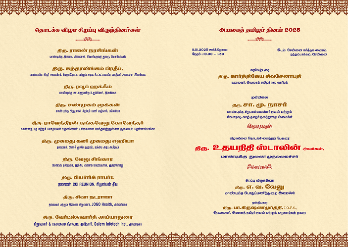 Special Guests were hosted at ITC Grand Chola Hotel. Additionally, Representatives of Tamil Associations from India and various countries were accommodated in 5-star and 4-star hotels for a three-day stay.